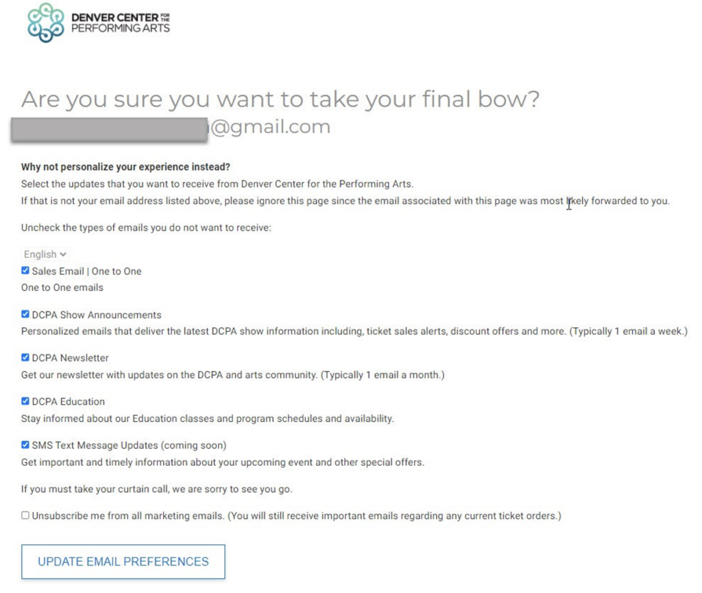 A Colorado staple, the Denver Center for the Performing Arts (DCPA) has a preference center that not only has options specific to their industry and offerings but also goes a step further and sets expectations for each category.
